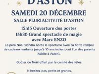 Le père Noel viendra après le spectacle avec sa hotte remplie de cadeaux (enfants jusqu'a 10 ans inclus dont l'un des parents habite ASTON)